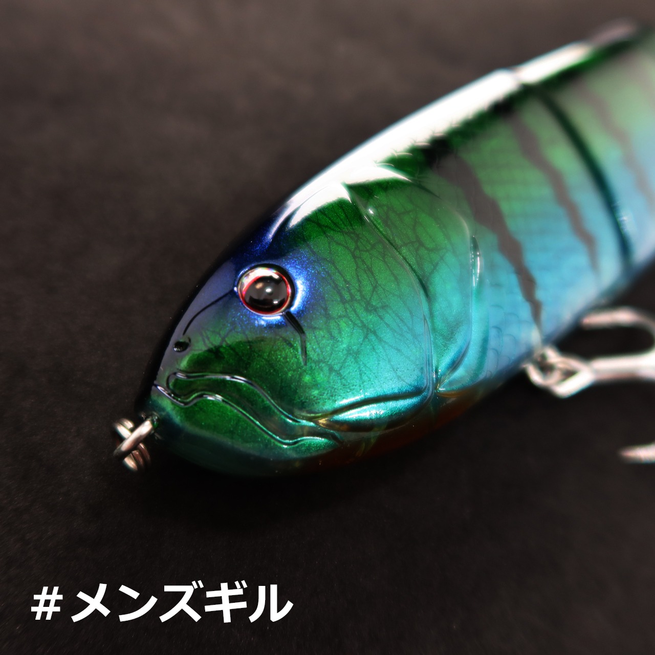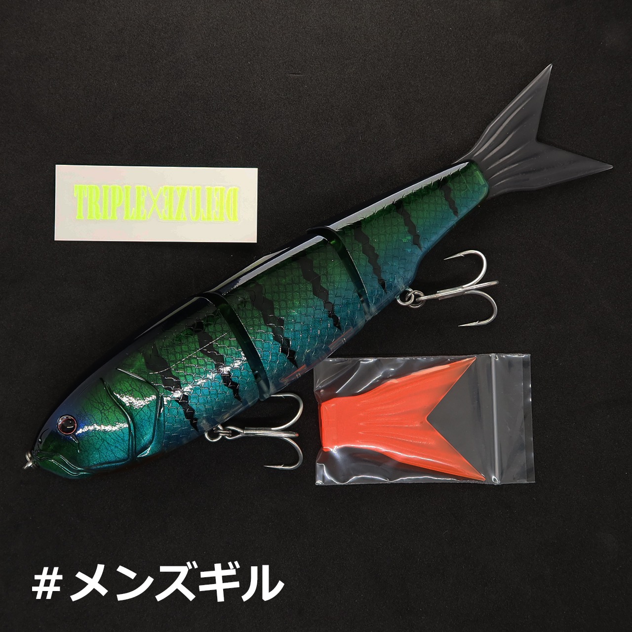 ジャイアントベイト「トリプルデラックス」は三連ジョイントでありながらS字系スイムベイトになります。一番の特徴が下抜きに360°ターン「ジェットコーストターン」をさせる事が出来ます。360°が下向きにさせる事でフロントフックにラインがカラミにくい状態を作る事が可能です。ソフトなトゥイッチの際に出るフラッシング効果で寄せて食わせる事が出来ます。